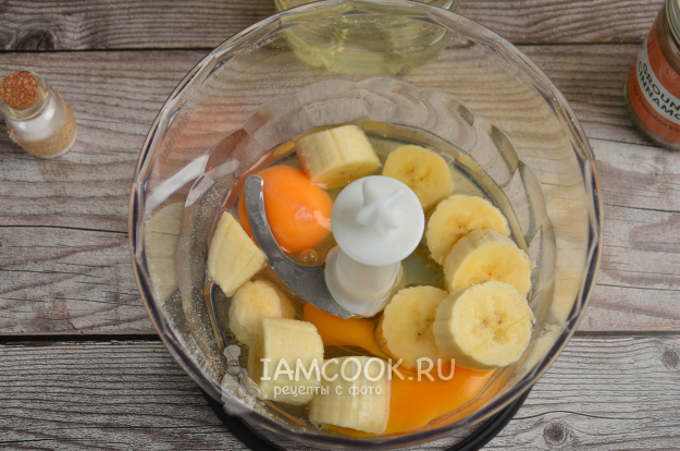 Далее в чашу блендера нужно вбить пару яиц и добавить очищенный и нарезанный банан. После накрыть чашу крышкой и измельчать в течение минуты.