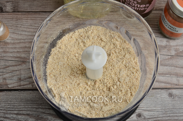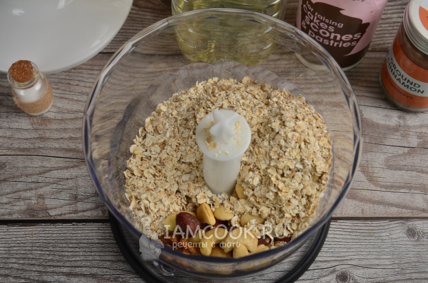 В чашу блендера нужно пересыпать овсяные хлопья, разрыхлитель и орехи.