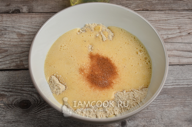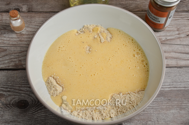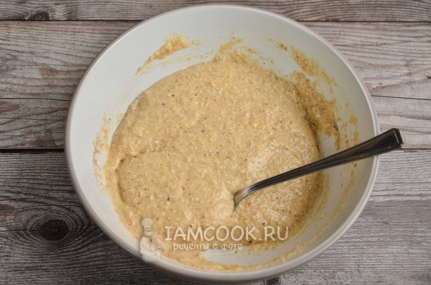 Часть муки можно отложить в чашку, остальное смешать с яично-банановой смесью.