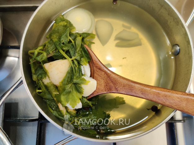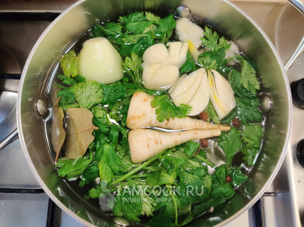 В кастрюлю влейте фильтрованную воду и добавьте любисток, корень петрушки, раздавленные зубчики чеснока, лавровый лист, душистый перец и половину головки репчатого лука. Варите бульон на среднем огне 15 минут, пока лук не станет мягким.