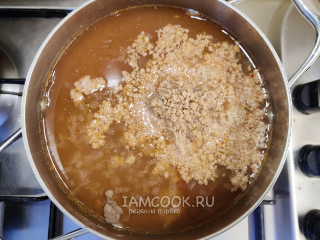 Поочередно опустите фрикадельки в кипящий бульон. Добавьте специи сунели и сушёную аджику. Вообще, харчо - это густой суп, но по желанию воды можно добавить больше.