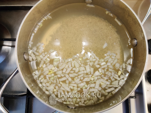 Добавьте в кастрюлю мелко нашинкованную половинку лука и промытый рис. Прокипятите бульон ещё 15 минут, пока рис не станет мягким.