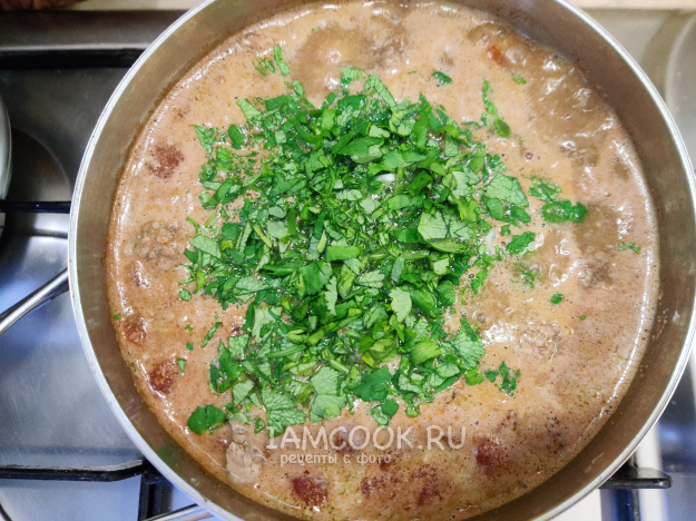 Перед подачей посолите и поперчите суп Харчо с фрикадельками и добавьте мелко нарезанную зелень кинзы.
