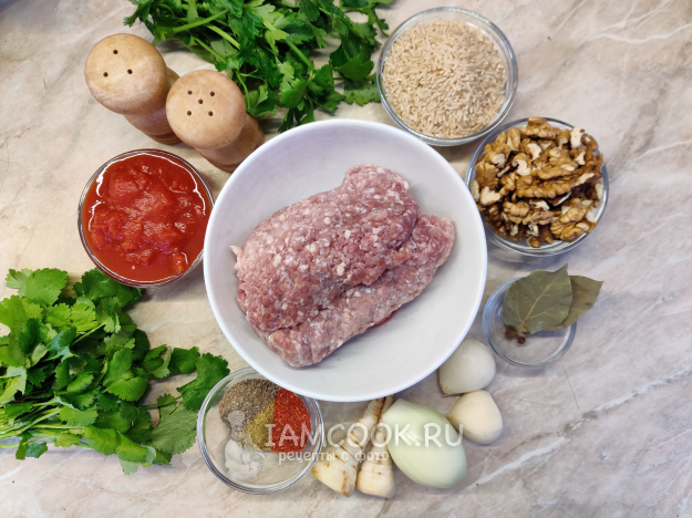 Подготовьте необходимые продукты для супа Харчо с фрикадельками. Фарш у меня уже готовый, домашний. Зелень тщательно промойте под проточной водой. Лук и чеснок очистите.