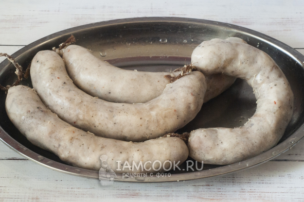 Помещаем колбаски в кастрюлю и начинаем медленный нагрев. Температура воды при варке не должна превышать 80 градусов. Чтобы легче было придерживаться этой температуры, лучше взять кастрюлю большого объема. Варим колбасу из свиной грудинки с момента достижения 80-ти градусов час. Контролируем, чтобы температура не поднималась выше.