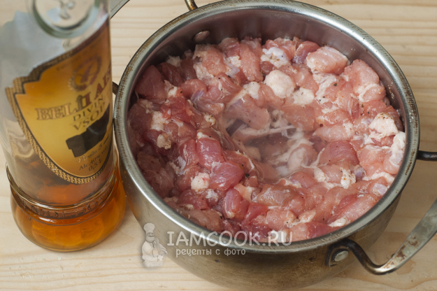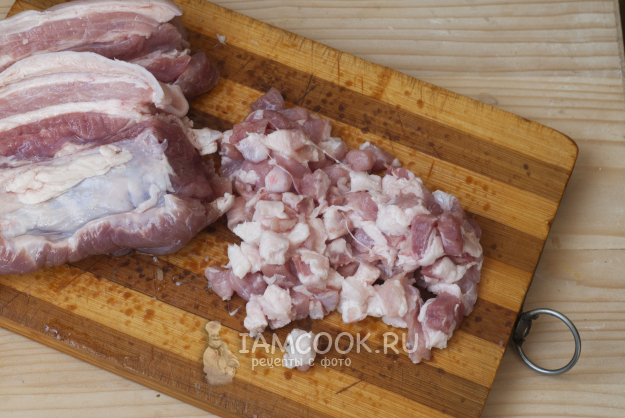 Свиную грудинку чуть примораживаем, чтобы было легче резать. Разрезаем грудинку на несколько кусков, помещаем их в холодильник (или морозилку), по одному достаем и нарезаем мелкими кусочками — 0,5-1 см. Нарезанные кусочки сразу же снова отправляем в холодильник (можно в морозилку). Нам не нужно их замораживать, нам нужно, чтобы мясо оставалось холодным.