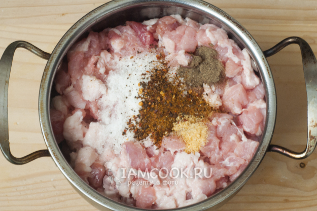 Мясо у нас сейчас холодное, добавим к нему соль и приправы. Начнем активное вымешивание.