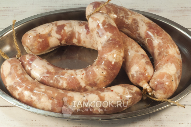 Формуем колбаски нужного нам размера, перекручивая или перевязывая череву. На конце завяжем череву бечевкой.