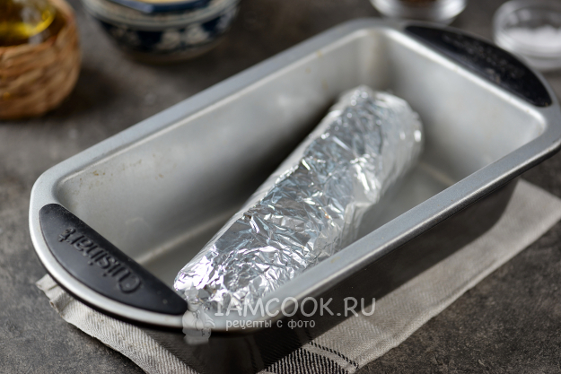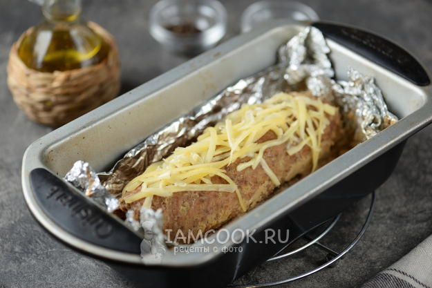 Сверните фарш с начинкой в рулет, скрутите фольгу на заготовке в виде конфеты, переложите в любую удобную форму. Влейте немного воды. Отправьте противень в предварительно разогретую до 190 градусов духовку на 40-50 минут в режиме без конвекции.