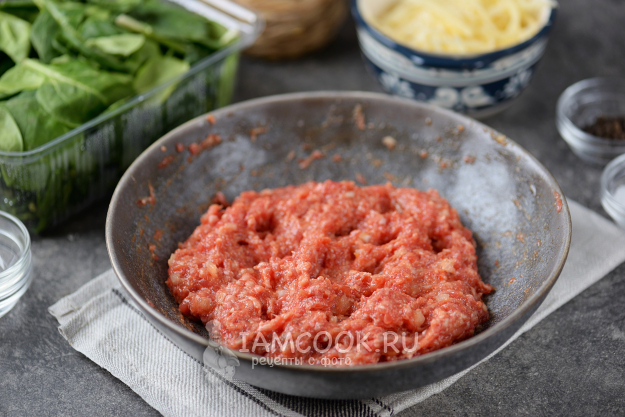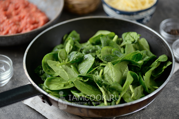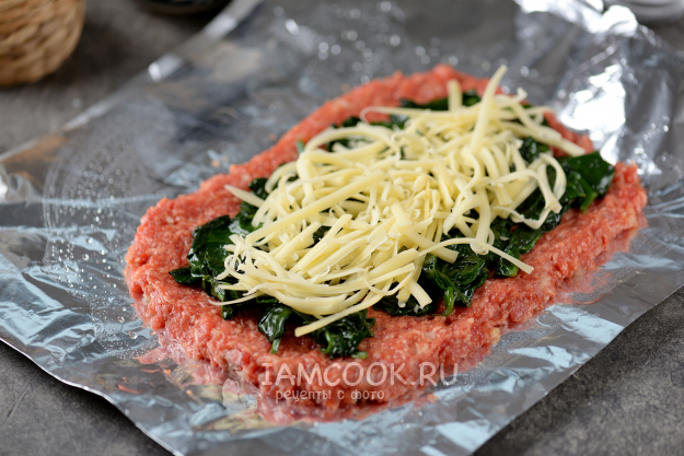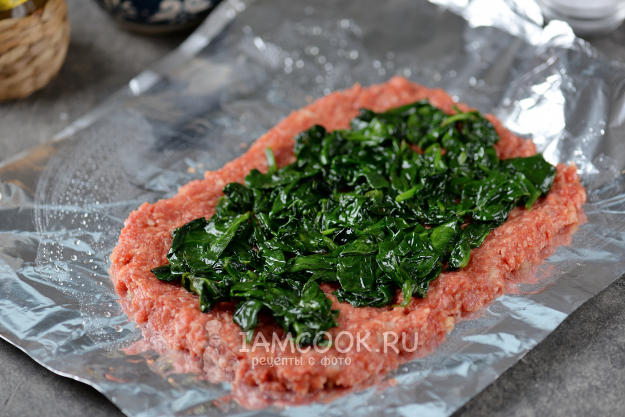 Положите на фарш слой слегка остывшего шпината, солить его не нужно, поскольку фарш и сыр перекроют его пресный вкус.