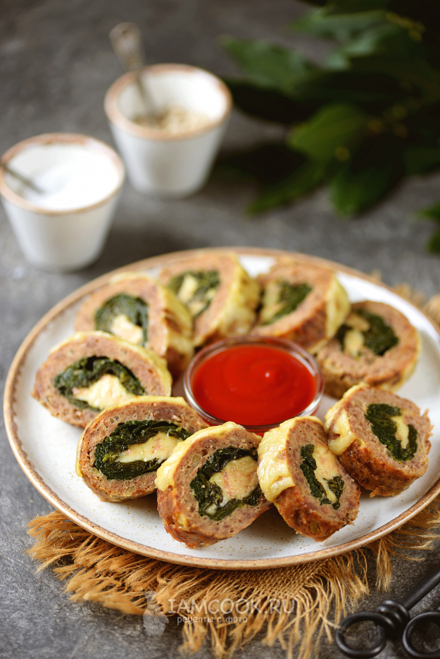 Мясной рулет со шпинатом и сыром нарежьте кружочками толщиной в сантиметр и подавайте к столу как горячую закуску с любимым соусом.