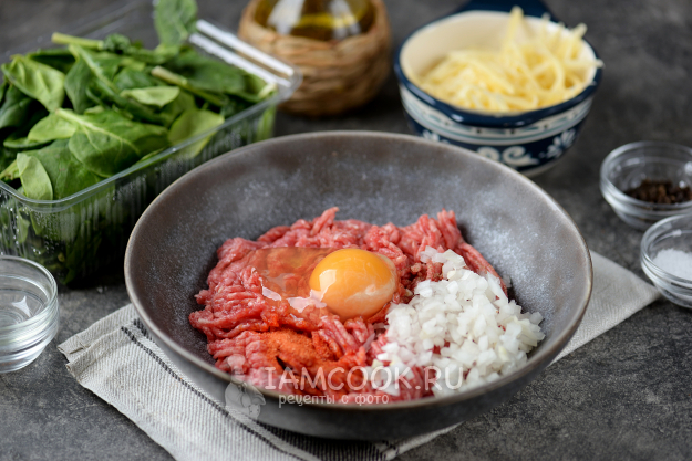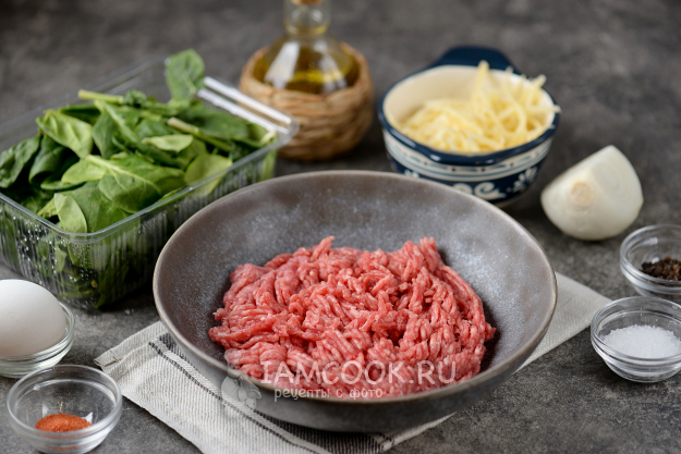 Подготовьте продукты для мясного рулета со шпинатом и сыром по списку. Сыр берите тот сорт, который не слишком плавится в духовке.