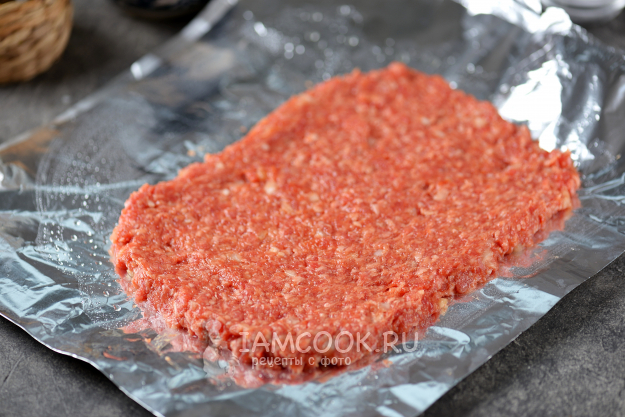 Возьмите большой кусок фольги, сложите ее пополам глянцевой стороной вверх, смажьте слегка растительным маслом. Выложите фарш на фольгу толщиной в 1 сантиметр, можно и чуть толще.