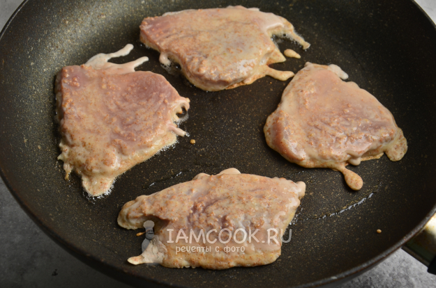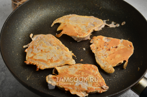 Через 3-4 минуты нужно перевернуть кусочки на другую сторону и жарить под крышкой еще минуты 3.