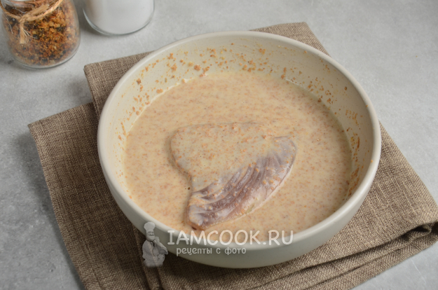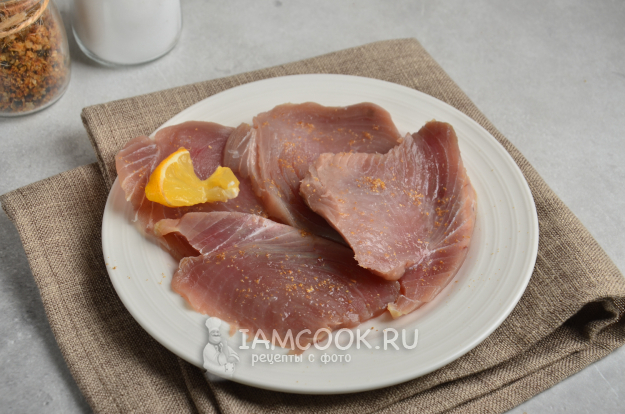 Если ломтики тунца толстые, можно разрезать их вдоль на более тонкие. Затем рыбу нужно подсолить, присыпать специями и сбрызнуть лимонным соком. Если есть время, можно оставить на четверть часа мариноваться, или же сразу перейти к следующему шагу.