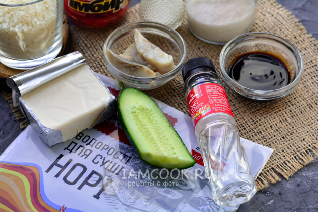 Подготовьте ингредиенты для роллов с селедкой и огурцом.