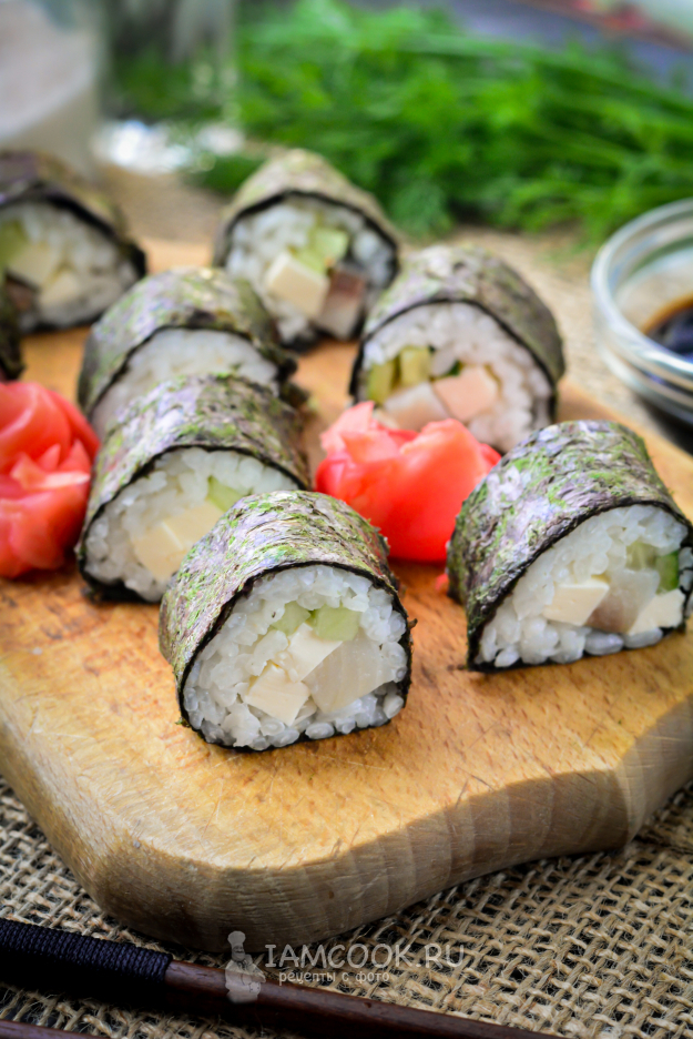 Готовую закуску подавайте с маринованным имбирем и соевым соусом. Приятного вам аппетита!