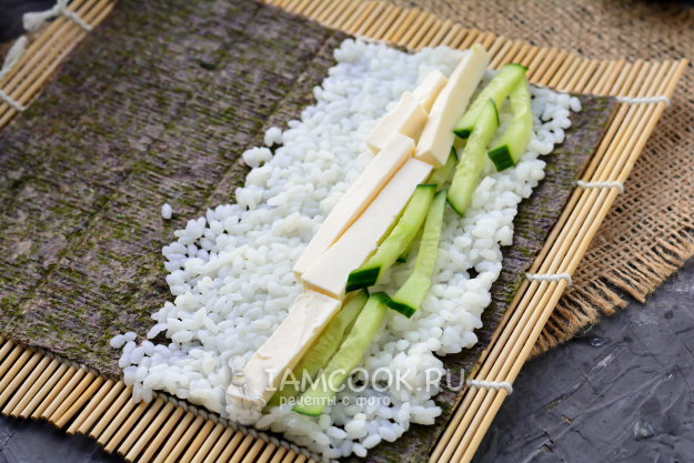 Выложите начинку - нарезанные полосками огурцы и сливочный сыр.