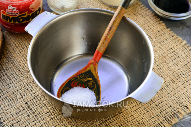 Приготовьте маринад для риса. Подогрейте рисовый уксус, всыпьте сахар и соль, размешайте, чтобы специи растворились. Снимите с огня, не кипятите.