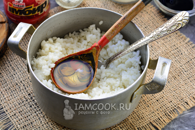 Влейте теплый маринад к полуготовому рису, перемешайте, дайте еще настояться под крышкой 5-6 минут. С рисовым уксусом рис будет вкусным, с приятной кислинкой. К тому же рис будет лучше склеиваться и не будет распадаться.