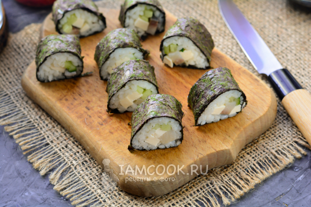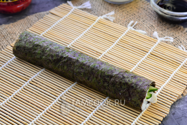 Сверните лист нори трубочкой, плотно прижимая. Удобно для этого использовать специальную бамбуковую циновку.