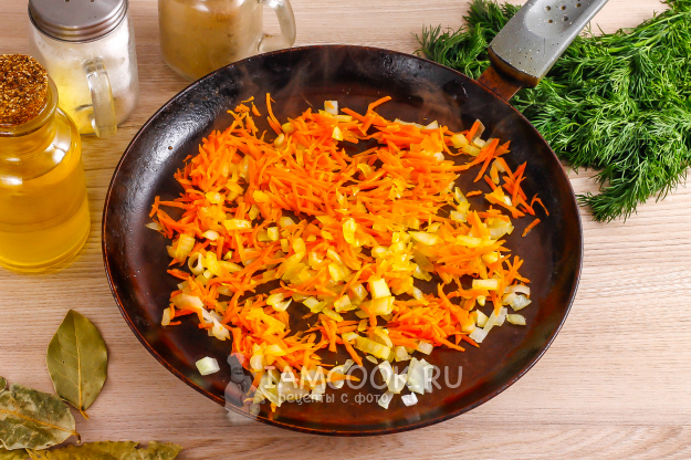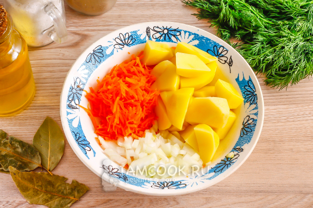 Лук и морковь обжарьте на сковороде в растительном масле примерно 3-5 минут. Затем добавьте в кастрюлю вместе с картофельной нарезкой, отварите примерно 15-20 минут.