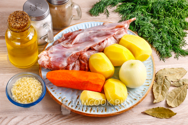 Итак, подготовьте необходимые ингредиенты для создания сытного супа из бараньих ребрышек с рисом и картошкой.