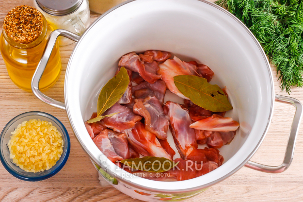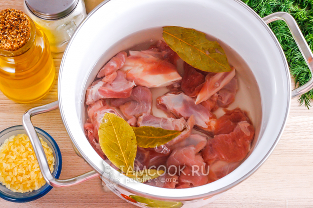 Баранину промойте в воде и срежьте пленки с ребрышек, коими так богат этот сорт мяса. Нарежьте ребрышки порционно и выложите в кастрюлю, добавляя и лавровые листья.