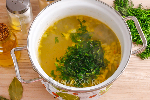 За 2 минуты до готовности всыпьте в суп измельченную зелень укропа, предварительно промыв его, соль, молотый черный перец. Попробуйте суп на вкус. Если любите более пикантные вкусы, то спрессуйте в бульон 1 очищенный зубчик чеснока.