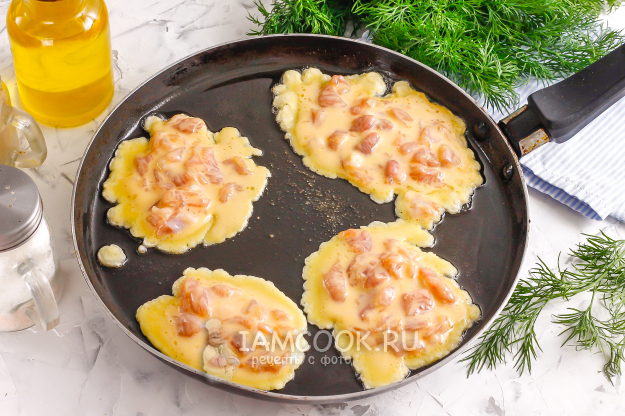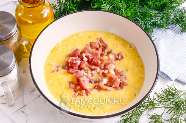 Промойте свинину в воде, срежьте жилы и пленки, нарежьте мякоть мелкими кубиками. Именно мелкими, так как они должны моментально прожариваться. Если не умеете нарезать мясо мелко, то сначала отбейте его, а затем нарежьте. Таким образом вы отобьете волокна мяса и оно быстрее прожарится. Добавьте нарезку в емкость с яичной массой.