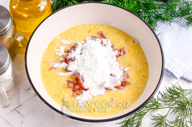 Всыпьте крахмал и аккуратно все перемешайте. Если крахмала нет в наличии, то его можно заменить пшеничной, кукурузной или рисовой мукой, но тогда желательно дать тесту немного отдохнуть - 20 минут.