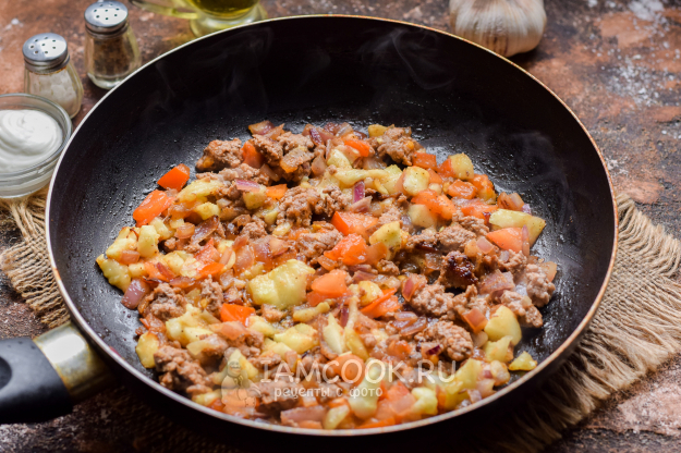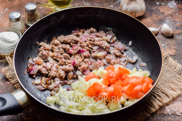 В сковороде разогреть растительное масло, выложить лук и фарш, жарить, помешивая, 5-6 минут. Мякоть кабачков мелко нарезать и добавить в сковороду, также нарезать помидор и тоже отправить ко всем ингредиентам, в сковороду.
