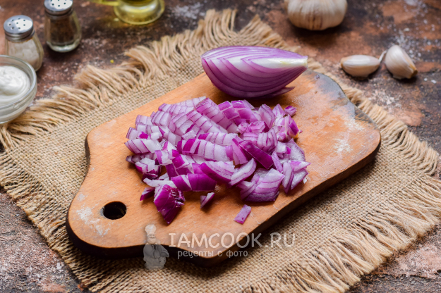 Очистить лук, ополоснуть и просушить. Нарезать лук небольшими кубиками.