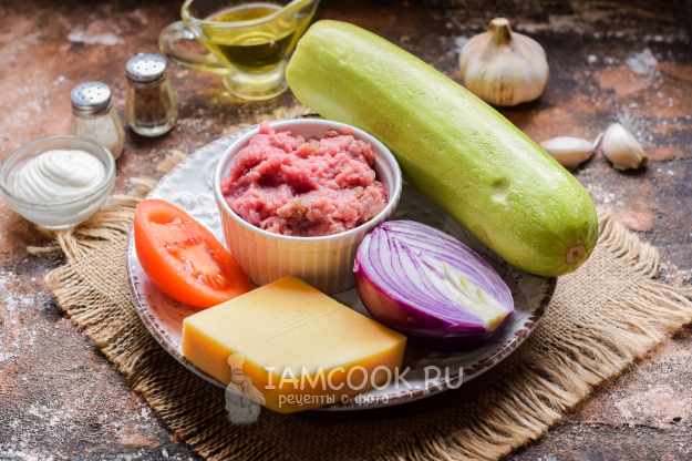 Подготовить все продукты для запекания кабачков с говяжьим фаршем в духовке. Говядину пропустить через мясорубку с мелкой решеткой.
