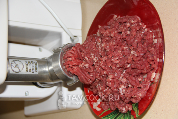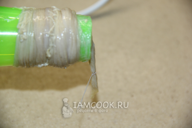 Подготовить мясорубку. Снять нож и прикрепить насадку для приготовления колбас. Кишку надеть на насадку, кончик перевязать ниткой.