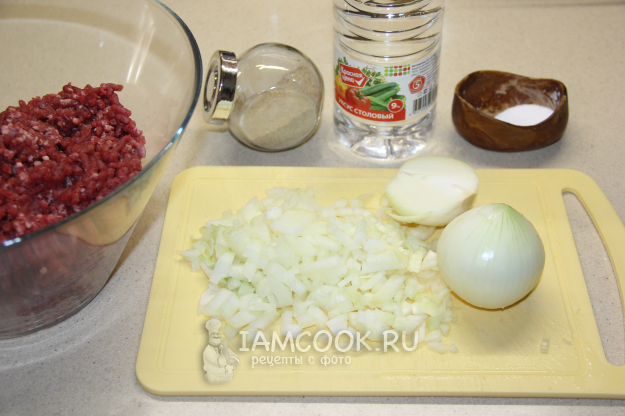 Возьмите продукты для приготовления купат в домашних условиях. Мясо предварительно разморозить при комнатной температуре. У меня - охлажденное мясо. Нарезать мясо на кусочки. Лук почистить.