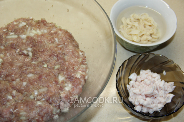 Добавить кусочки сала в фарш и хорошо перемешать.