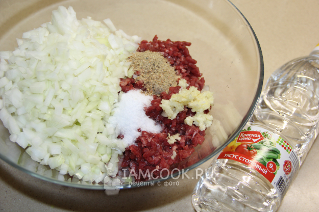 Соединить мясной фарш, соль и специи. Чеснок почистить и пропустить через пресс. Добавить чеснок и уксус в фарш.