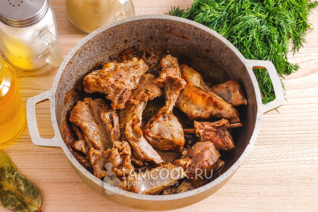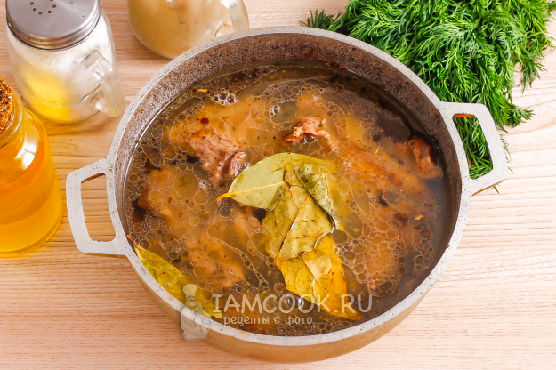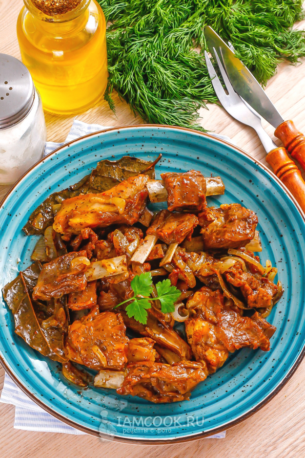Когда мясо покроется золотистой корочкой, влейте кипяток, всыпьте лавровые листья и потушите в течение 1 часа на умеренном нагреве, слегка прикрыв емкость крышкой. При тушении бараньих ребрышек в казане будет выделяться пена, поэтому полностью казан крышкой не закрывайте.