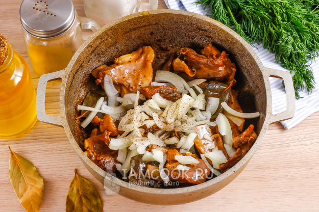 Спустя указанное время практически вся жидкость выпарится. Очистите лук и чеснок от кожуры, нарежьте полукольцами, а чеснок - мелкими кубиками. Добавьте обе нарезки в казан и перемешайте, чтобы бараньи ребра оказались сверху, а нарезки - на дне. Обжарьте в течение 3-4 минут до румяности лука.