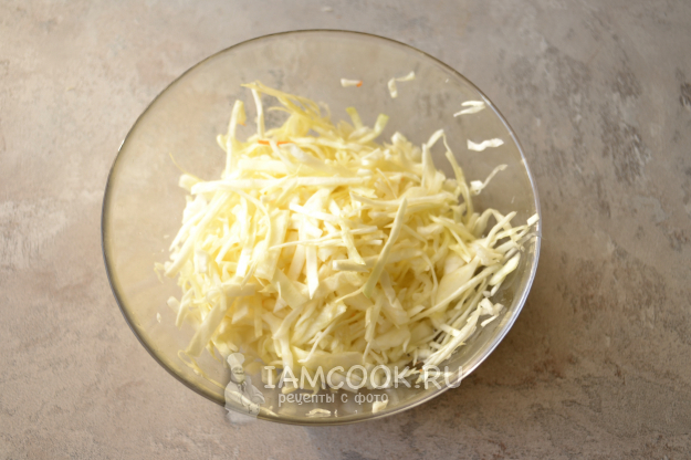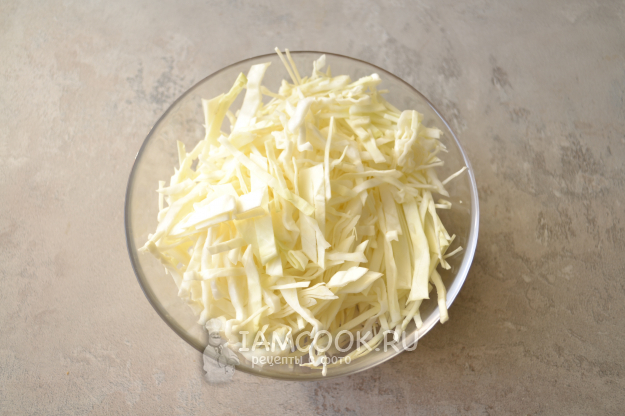 Пока тесто "отдыхает", нашинкуйте тонкой соломкой капусту белокочанную.