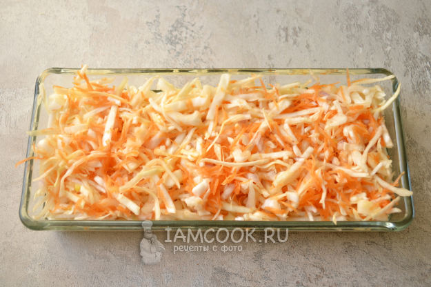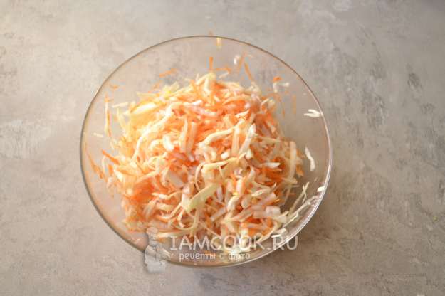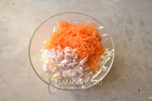 Очищенную морковь натрите на средней терке и добавьте к капусте. Репчатый лук нарежьте мелким кубиком и тоже добавьте к капусте.