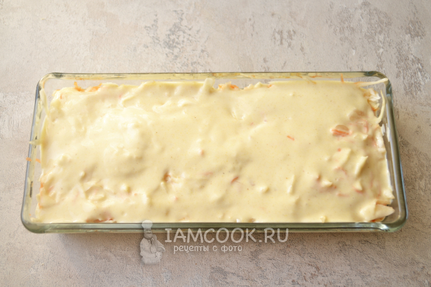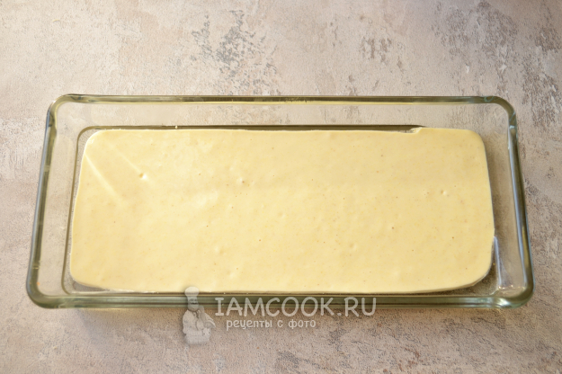 Подходящую форму для запекания смажьте растительным маслом (1 ст.л.) и влейте примерно половину теста.