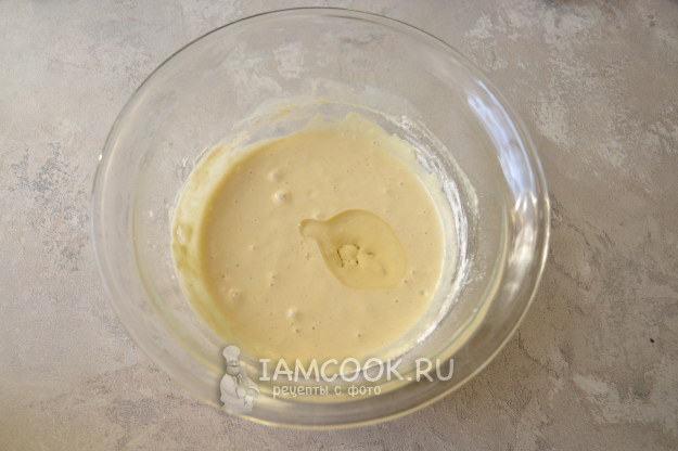 Еще раз перемешайте тесто, чтобы не осталось ни комочка муки, и влейте растительное масло. Перемешайте тесто с маслом и оставьте на 5-10 минут.
