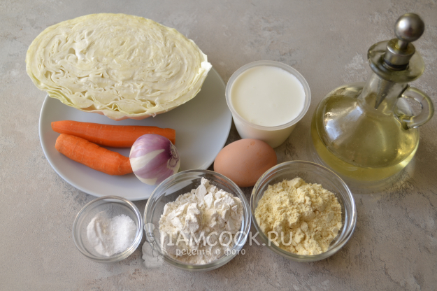 Возьмите продукты для приготовления ПП пирога с капустой на кефире.