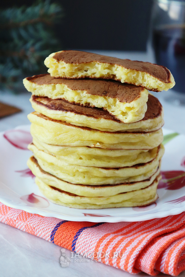 Вкусные, ароматные и очень аппетитные панкейки на кефире с творогом готовы. Сложим их горочкой и подадим к столу в тёплом виде.