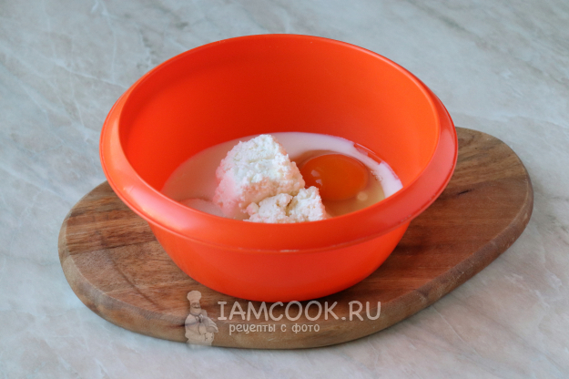 Кефир (у меня - 1%) вольем в миску, добавим куриное яйцо, сахарный песок, творог и растительное масло.