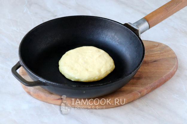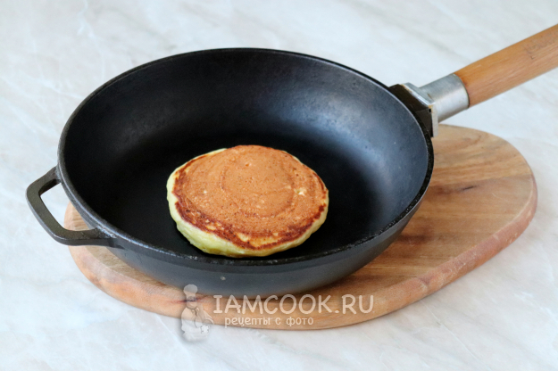 Разогреем сковороду. Творожная выпечка всегда капризнее обычной, поэтому нужно перед жаркой первого панкейка смазать сковороду тонким слоем растительного масла или же использовать сковороду с хорошим антипригарным покрытием. Выложим две столовые ложки теста приблизительно по центру, сформировав круглую заготовку. Выставим нагрев ниже среднего. Когда на поверхности панкейка начнут появляться дырочки - перевернём его на другую сторону, с помощью деревянной или силиконовой лопатки.