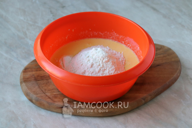 Добавим в жидкую основу пшеничную муку, смешанную с разрыхлителем.