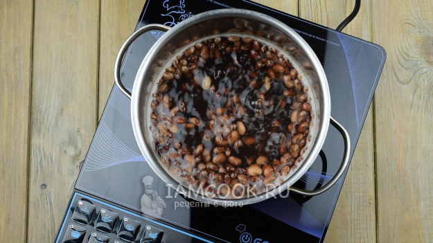 Фасоль уже сварилась. Сольем воду, в которой она варилась, и зальем свежую бутилированную (2 литра).